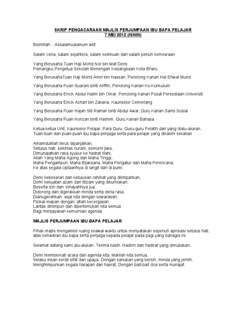 Skrip Pengacaraan Majlis an Ibu Bapa Pelajar